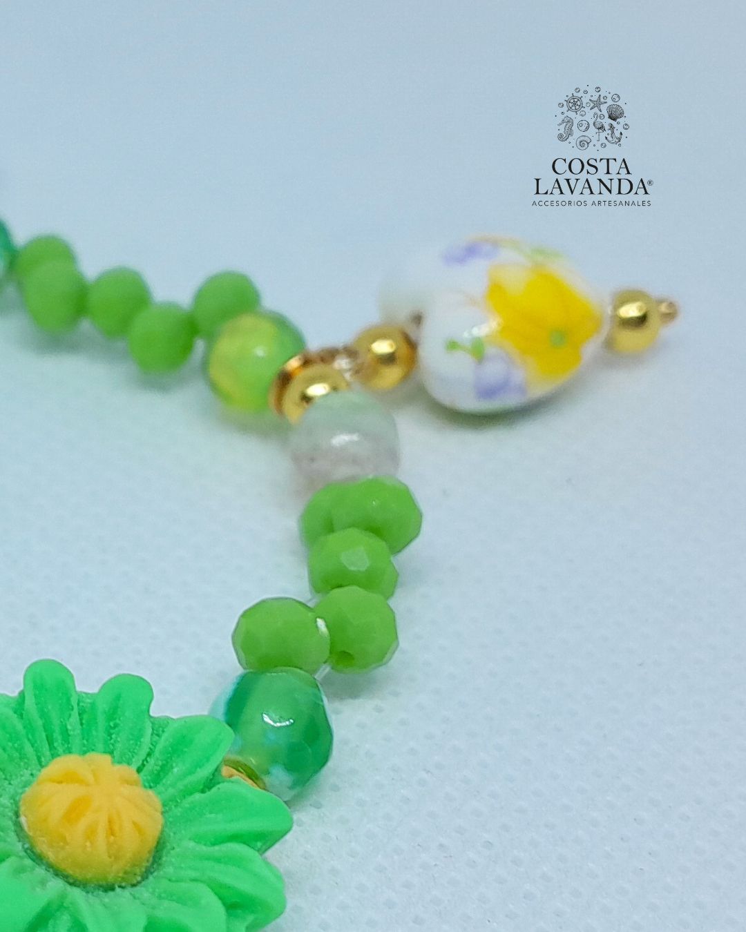 Collar tipo princesa hecho a mano con amor, inspirado en el estilo Pin-Up de Costa Lavanda Accesorios, creado a base de cuentas de cristal blancas y verdes, abalorios de plástico dorados, hilo de nailon de dos hebras, dijes con forma de corazón de cerámica, con forma de margarita de plástico y de frutita hecha de plástico y cierre de langosta metálico dorado. Largo total de la pieza 48 cm.
